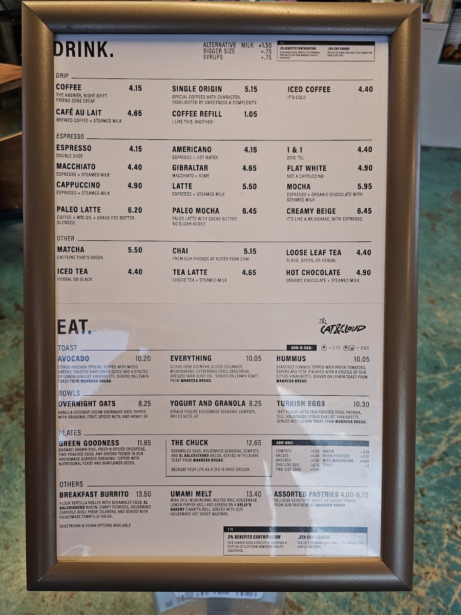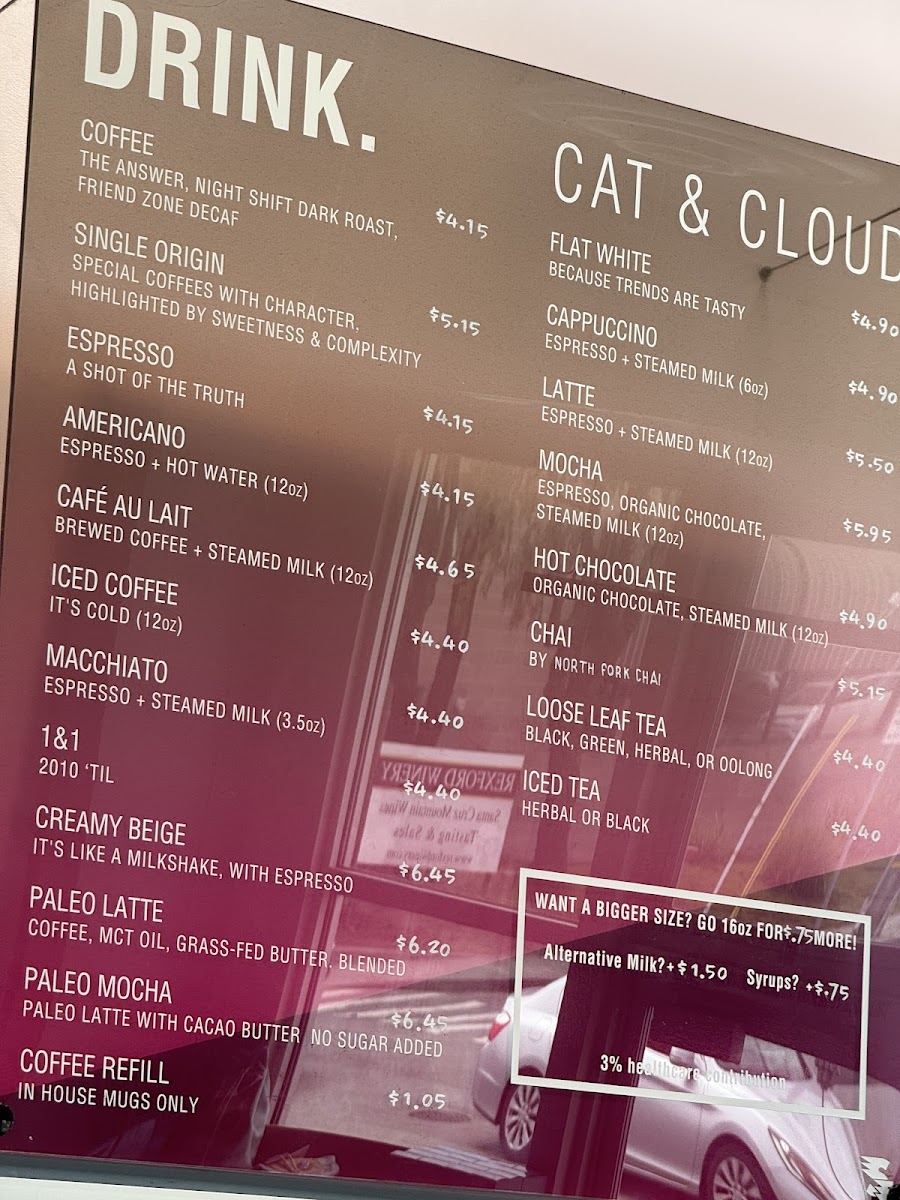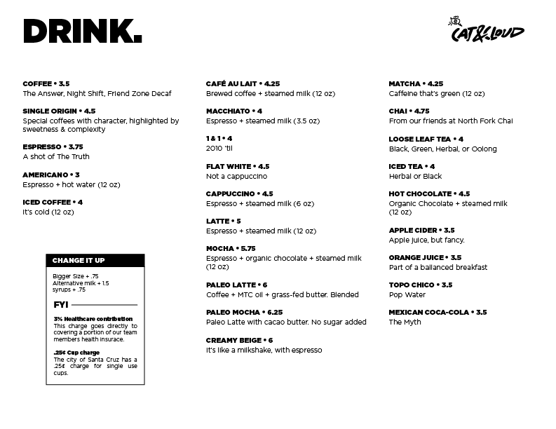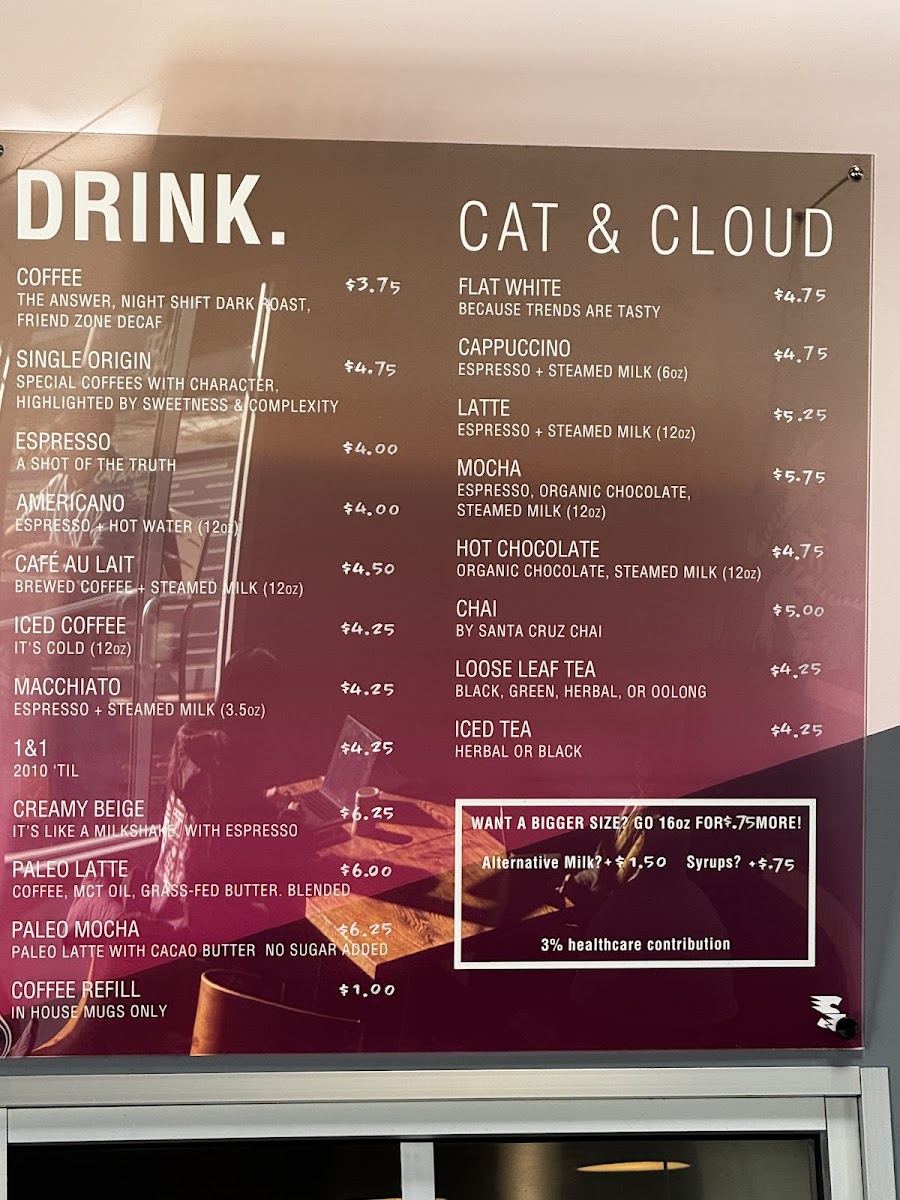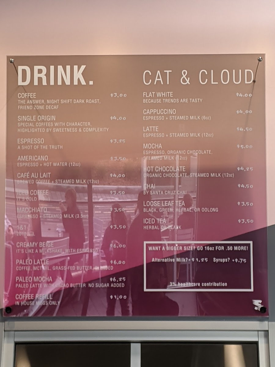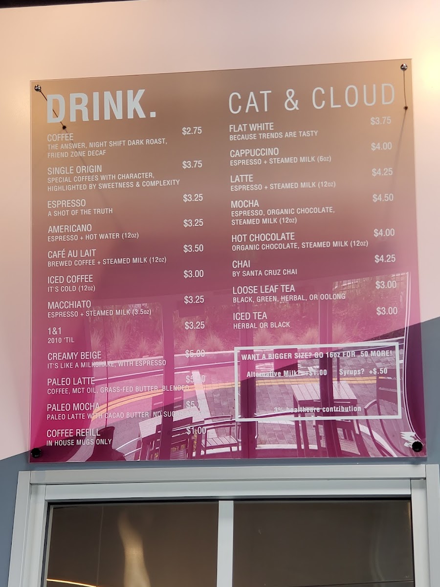 Welcome to Cat & Cloud Coffee, a vibrant gem nestled in Santa Cruz. This café offers a thoughtfully curated menu that marries exceptional coffee with wholesome bites. The coffee selections start at a reasonable US$3.50 and showcase single-origin brews, rich espressos, and indulgent drinks like the Creamy Beige and Paleo Latte, all crafted to elevate your daily caffeine ritual.