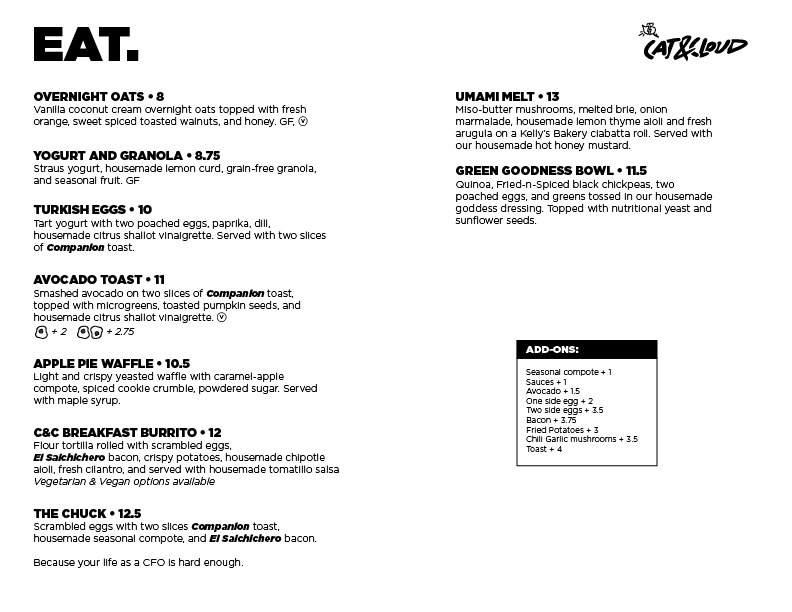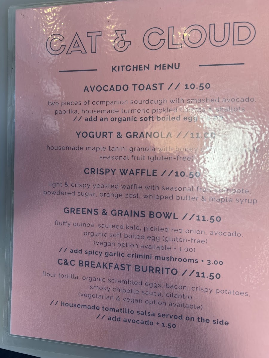 For breakfast, the menu features delightful options such as Overnight Oats and Turkish Eggs. Each dish is designed to be both nourishing and delicious, exemplified by the flavor-packed Breakfast Burrito, which diners rave about. The friendly staff enhances the experience, creating a welcoming atmosphere where every visit feels like catching up with friends. Cat & Cloud isn’t just about coffee; it’s a community hub that inspires connection and joy with every sip and bite.